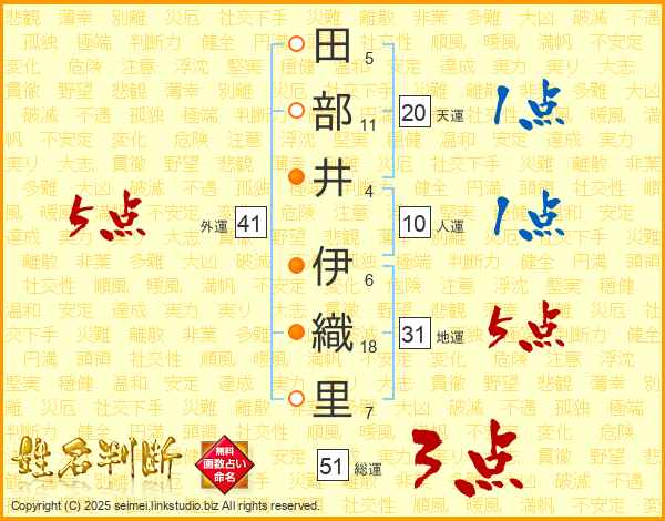 田(5画)部(11画)井(4画) 伊(6画)織(18画)里(7画)