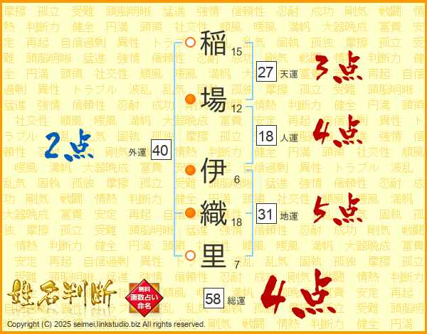 稲(15画)場(12画) 伊(6画)織(18画)里(7画)