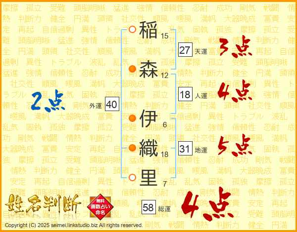 稲(15画)森(12画) 伊(6画)織(18画)里(7画)