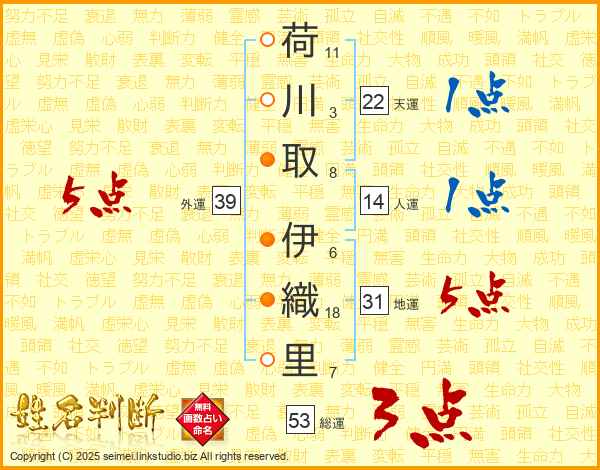 荷(11画)川(3画)取(8画) 伊(6画)織(18画)里(7画)