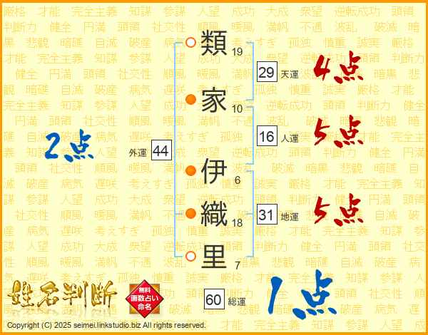 類(19画)家(10画)  伊(6画)織(18画)里(7画)