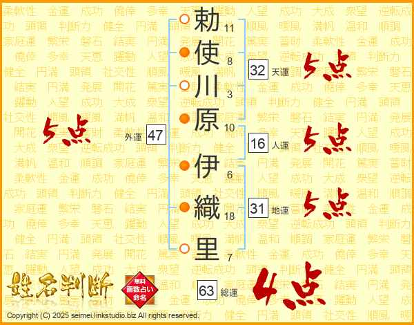 勅(11画)使(8画)川(3画)原(10画) 伊(6画)織(18画)里(7画)