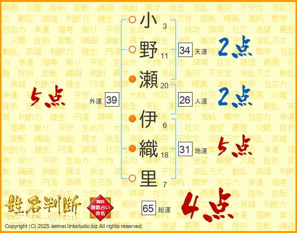小(3画)野(11画)瀬(20画) 伊(6画)織(18画)里(7画)