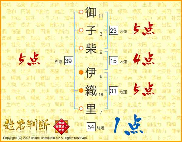 御(11画)子(3画)柴(9画) 伊(6画)織(18画)里(7画)