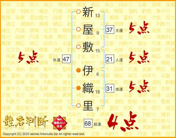 新(13画)屋(9画)敷(15画) 伊(6画)織(18画)里(7画)