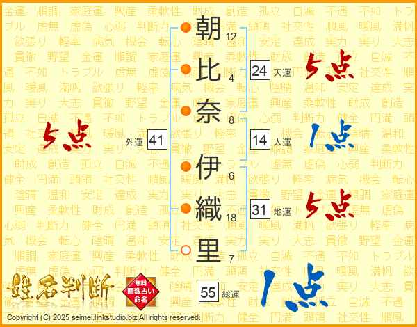 朝(12画)比(4画)奈(8画) 伊(6画)織(18画)里(7画)