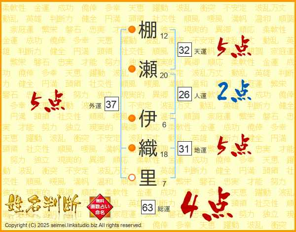 棚瀬伊織里さんの総運は63画の4点!