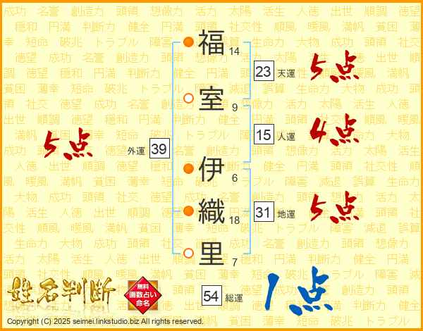 福(14画)室(9画) 伊(6画)織(18画)里(7画)