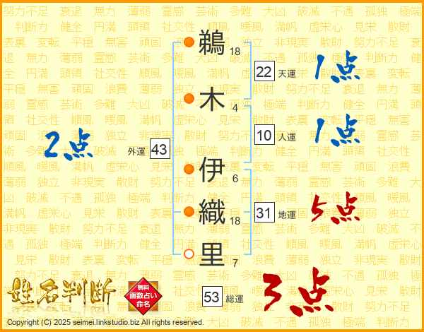 鵜(18画)木(4画) 伊(6画)織(18画)里(7画)