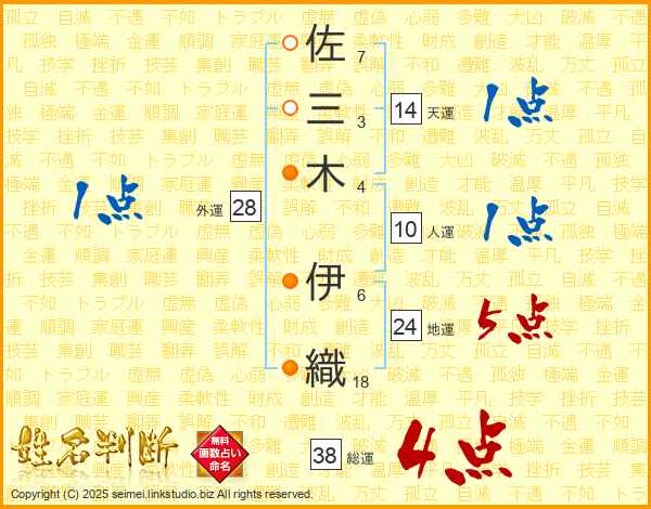 佐(7画)三(3画)木(4画) 伊(6画)織(18画)