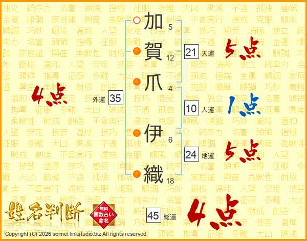 加(5画)賀(12画)爪(4画) 伊(6画)織(18画)
