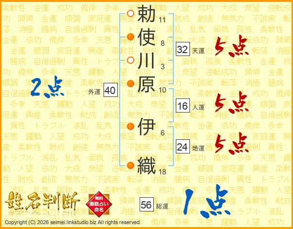 勅使川原伊織さんの総運は56画の1点!