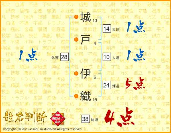 城(10画)戸(4画) 伊(6画)織(18画)