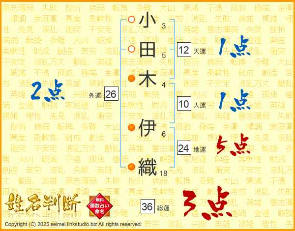 小(3画)田(5画)木(4画) 伊(6画)織(18画)