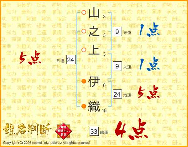 山(3画)之(3画)上(3画) 伊(6画)織(18画)