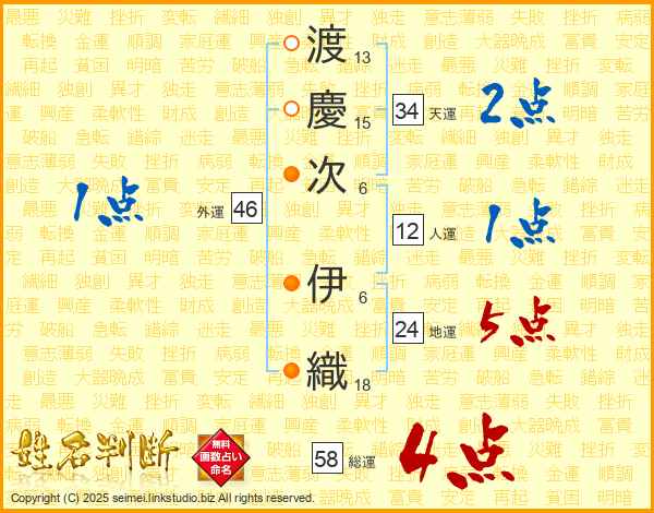 渡(13画)慶(15画)次(6画) 伊(6画)織(18画)