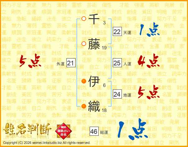 家系が持つ宿命的な運勢を表します。祖先から受け継いだ苗字ですので自分の力が及びません。家柄を象徴します。苗字の合計画数。