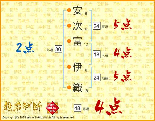 安(6画)次(6画)富(12画) 伊(6画)織(18画)