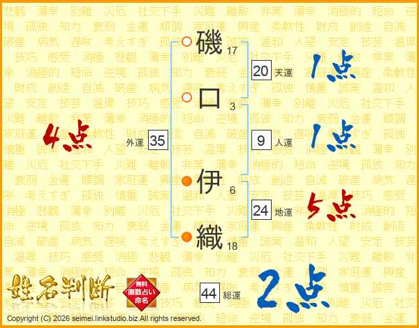 生活面を象徴する運勢です。外部から受ける影響力を表し、結婚運、家庭運や職場、環境への順応性を表します。総運から人運を引いた画数。姓や名が1文字の場合を除く。