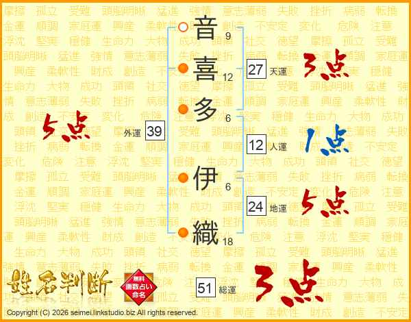 音(9画)喜(12画)多(6画) 伊(6画)織(18画)