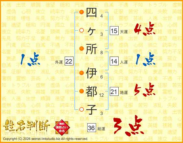 四ヶ所伊都子さんの総運は36画の3点!