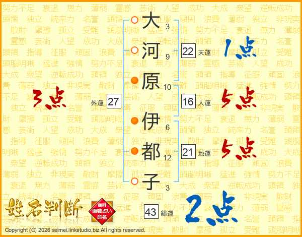 大(3画)河(9画)原(10画) 伊(6画)都(12画)子(3画)