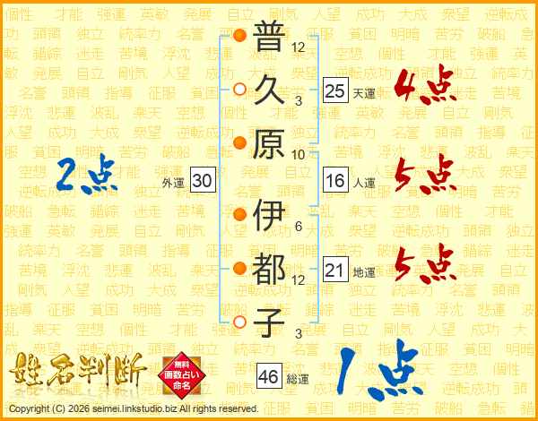 普(12画)久(3画)原(10画) 伊(6画)都(12画)子(3画)