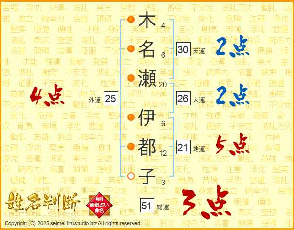 木(4画)名(6画)瀬(20画) 伊(6画)都(12画)子(3画)