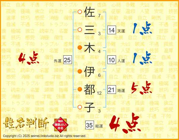 佐(7画)三(3画)木(4画) 伊(6画)都(12画)子(3画)