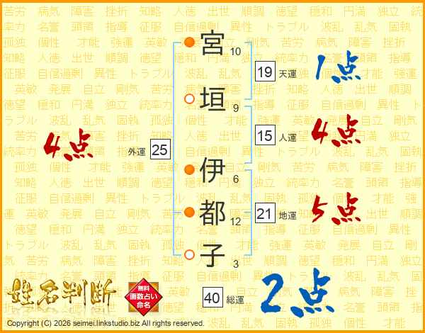宮(10画)垣(9画) 伊(6画)都(12画)子(3画)