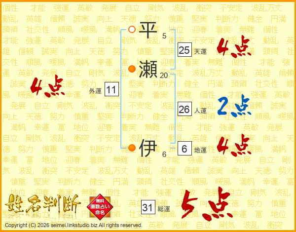 家系が持つ宿命的な運勢を表します。祖先から受け継いだ苗字ですので自分の力が及びません。家柄を象徴します。苗字の合計画数。
