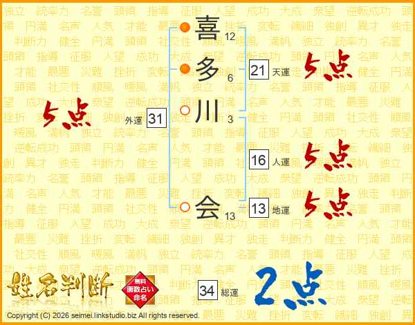 あなたの人生を表す1番重要な運勢です。生涯を通じて影響する総合運となり、主に50歳以降の晩年期に影響を及ぼします。苗字と名前の合計画数。