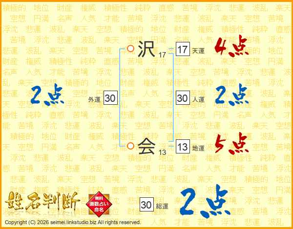 生活面を象徴する運勢です。外部から受ける影響力を表し、結婚運、家庭運や職場、環境への順応性を表します。総運から人運を引いた画数。姓や名が1文字の場合を除く。