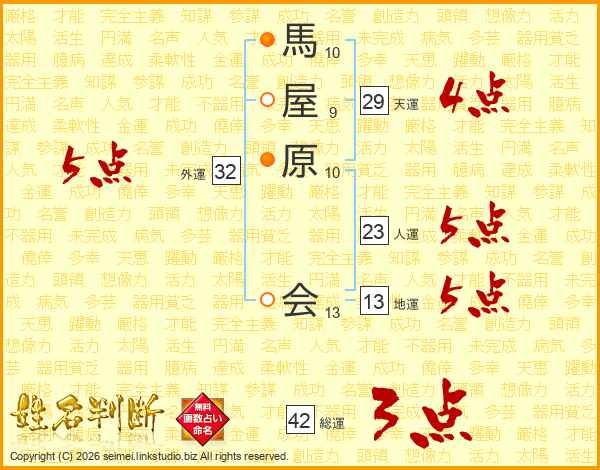 生活面を象徴する運勢です。外部から受ける影響力を表し、結婚運、家庭運や職場、環境への順応性を表します。総運から人運を引いた画数。姓や名が1文字の場合を除く。