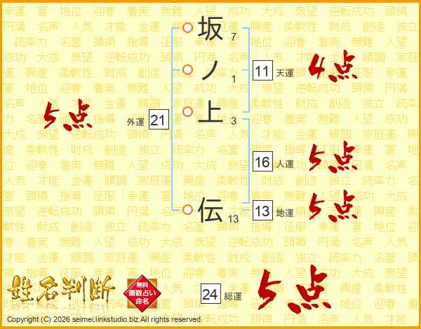 坂(7画)ノ(1画)上(3画) 伝(13画)