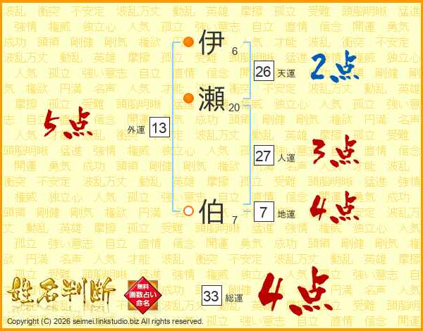 家系が持つ宿命的な運勢を表します。祖先から受け継いだ苗字ですので自分の力が及びません。家柄を象徴します。苗字の合計画数。