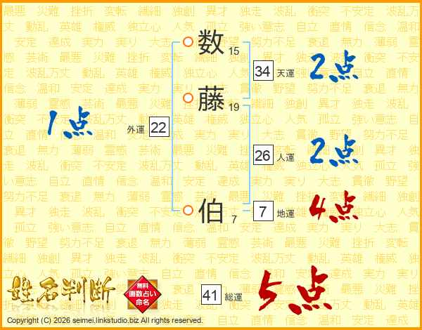 あなたの人生を表す1番重要な運勢です。生涯を通じて影響する総合運となり、主に50歳以降の晩年期に影響を及ぼします。苗字と名前の合計画数。