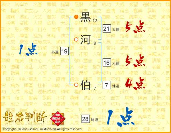 あなたの人生を表す1番重要な運勢です。生涯を通じて影響する総合運となり、主に50歳以降の晩年期に影響を及ぼします。苗字と名前の合計画数。