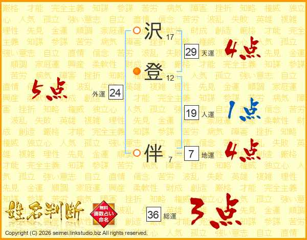 沢(17画)登(12画) 伴(7画)