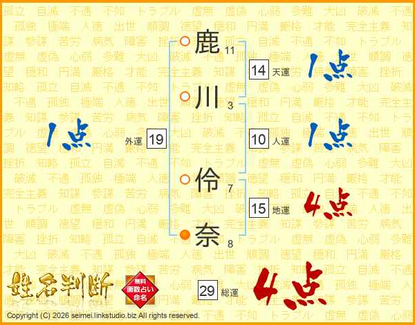 鹿(11画)川(3画) 伶(7画)奈(8画)