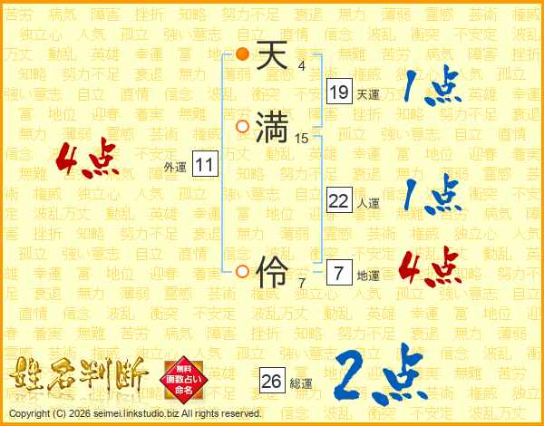 天(4画)満(15画) 伶(7画)