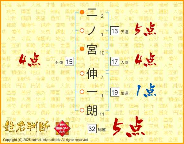 二(2画)ノ(1画)宮(10画) 伸(7画)一(1画)朗(11画)