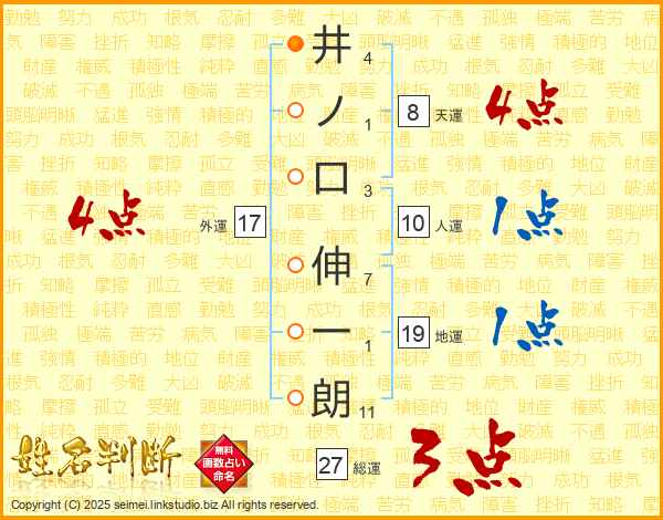 井(4画)ノ(1画)口(3画) 伸(7画)一(1画)朗(11画)