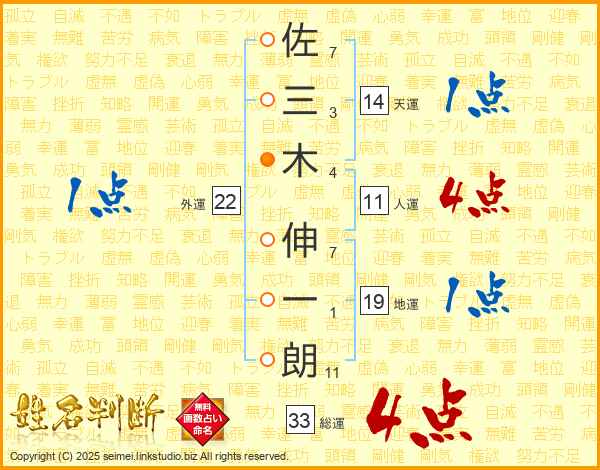 佐(7画)三(3画)木(4画) 伸(7画)一(1画)朗(11画)