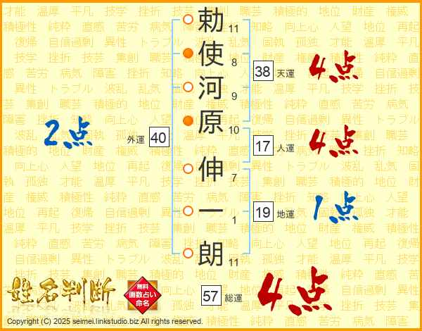 勅(11画)使(8画)河(9画)原(10画) 伸(7画)一(1画)朗(11画)