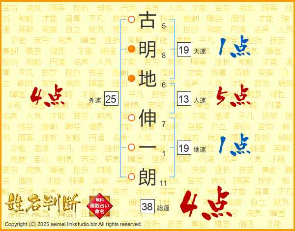 古(5画)明(8画)地(6画) 伸(7画)一(1画)朗(11画)