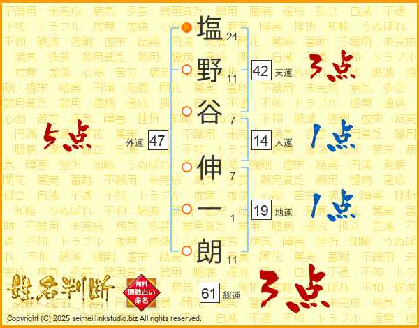 塩(24画)野(11画)谷(7画) 伸(7画)一(1画)朗(11画)