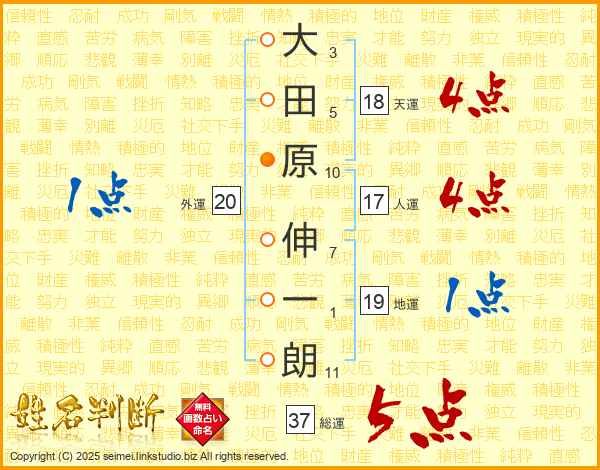 大(3画)田(5画)原(10画) 伸(7画)一(1画)朗(11画)