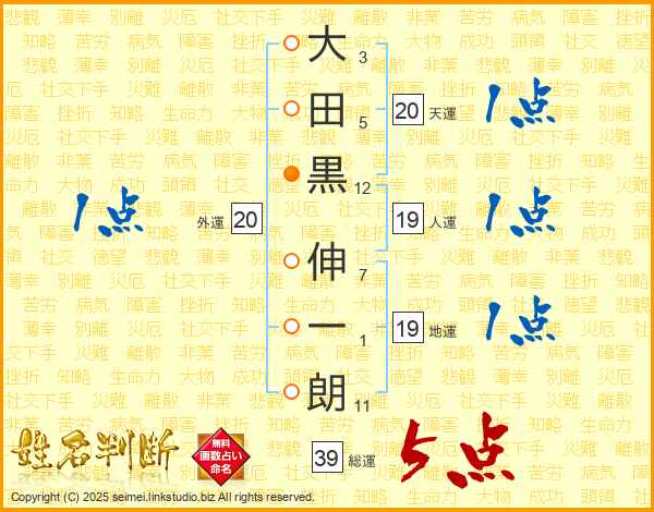 大田黒伸一朗さんの総運は39画の5点!
