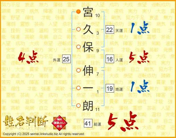 宮(10画)久(3画)保(9画) 伸(7画)一(1画)朗(11画)